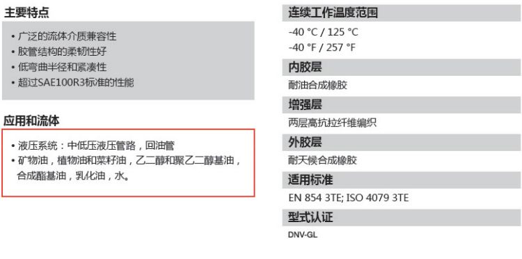 主要特點(diǎn):廣泛的流體介質(zhì)兼容性;膠管結(jié)構(gòu)的柔韌性好;低彎曲半徑和緊湊性;超過(guò)SAE100R3標(biāo)準(zhǔn)的性能;應(yīng)用和流體:液壓系統(tǒng):中低壓液壓管路,回油管;礦物油,植